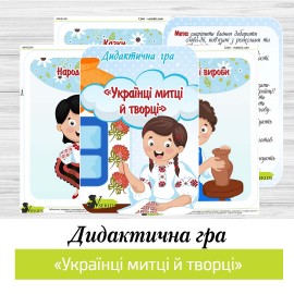 Дидактична гра з народознавства «Українські майстри та їх вироби» Гра містить титульну сторінку; мету, матеріали та хід гри, картки із зображеннями народних умільців за роботою (6 шт); картки зображеннями виробів майстрів (30 шт) Мета гри: закріплювати знання дітей про народні ремесла, про майстрів-умільців: гончара, різьбяра, коваля, вишивальницю, ткалю, майстра лозоплетіння …